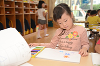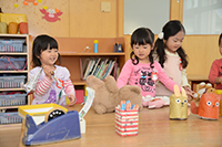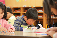 受け身で強いられる学習は、長い目で見れば主体性や学習意欲を損ない、その子どもが得意なことを追究する妨げにすらなることがあります。かといって、幼児期に学習は必要ない、ということは決してありません。幼児期からの良い環境と質の高い教育を主体的に受けることが将来伸びる力を育てます。 本園が読み聞かせや貸出図書に重きを置くのは、子どもが楽しめるから、という理由だけではありません。将来のすべての学習の基本となる「言語能力」や「イメージ力」、「想像力」、「読解力」を、子ども自身が主体的に育てていくことができるのが絵本であるからです。このことによって、例えば本園の文字指導や楽器指導では、低年齢からの無理な反復練習やカードなどによる「暗記」に頼らずとも、十分に学ぶことができるのです。 培ったイメージや創造力は、製作の作品発表(作品展)や、発表会の劇発表、合奏、様々な造形表現等にも確実につながっていきます。本園の子どもたちは楽しみながら高度な表現力を身につけていきます。