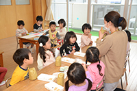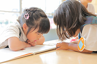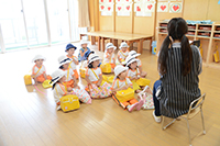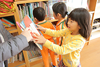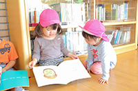 毎日、豊富な蔵書の中から良質な絵本の読み聞かせを行い、絵本や図鑑、児童書の貸出を毎朝行っております。幼児期に読み聞かせをたっぷり受けた子どもたちの学力等が高くなることは、数々の研究調査からも明らかとなっております。 貸出図書の園ですので、お子さんが借りてきたらおうちで読んであげてください。子どもはひらがなの拾い読みも楽しんで行いますが、7歳までは読んでもらう方が理解するといわれております。また、親子での読書は、かけがえのない時間や思い出となるでしょう。ご家庭との協力により本好きな子どもたちを育てていきたいと考えております。